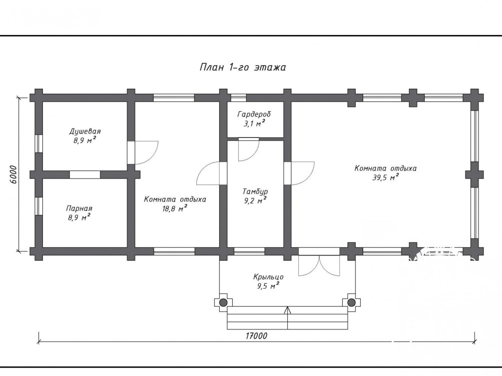 Планировка бани рассчитана сразу на несколько отдыхающих: здесь две комнаты отдыха, одна площадью 39,5 м2, вторая — 18,8 м2. В них большие окна, что визуально дополнительно расширяет пространство, наполняет помещения светом. Есть также тамбур, гардероб, душевая и парная. Большое крытое крыльцо перед входом можно использовать как место отдыха на свежем воздухе после водных процедур и парилки. Для долгой беспроблемной эксплуатации бани нижние венцы и лаги пола будут обработаны антисептиком. Это защитит дерево от биопоражений.