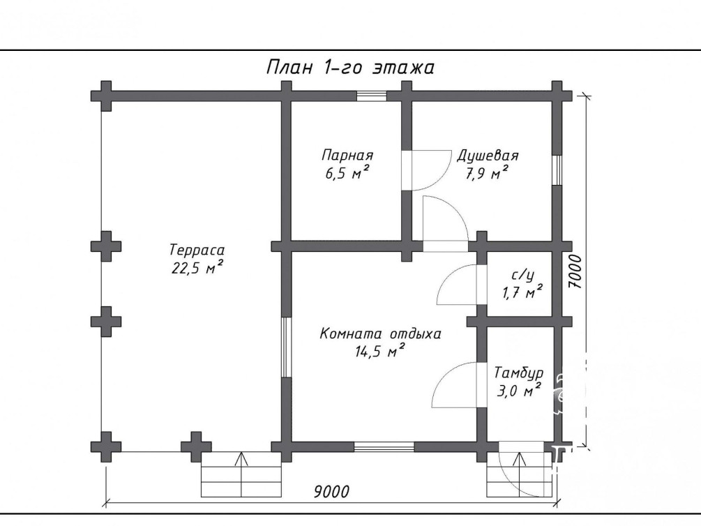 В качестве материала сруба мы предлагаем вам выбор между оцилиндрованным и рубленым бревном — от этого зависит окончательная стоимость реализации проекта. В любом случае нижние венцы и лаги пола будут обработаны антисептическим средством, а межвенцовые зазоры будут утеплены мхом. Мы выбираем этот материал за его экологичность, отличные теплоизолирующие и антибактериальные свойства. Это гарантирует, что баня прослужит вам долго, будет радовать теплом и уютом.