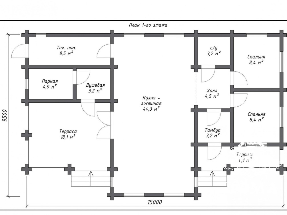 Планировка дома учитывает потребности жильцов и в совместном досуге, и в уединении. Она предусматривает наличие двух небольших спален, санузла, технического помещения, душевой и парной, а также большой кухни-гостиной. Такой проект можно использовать для строительства гостевого дома. С двух сторон расположены крытые террасы, одна площадью 18,1 м2, вторая меньше. На большой террасе летом можно поставить уличную мебель: столик, кресла, шезлонги или качели, чтобы превратить ее в комфортное место для семейных и дружеских посиделок.