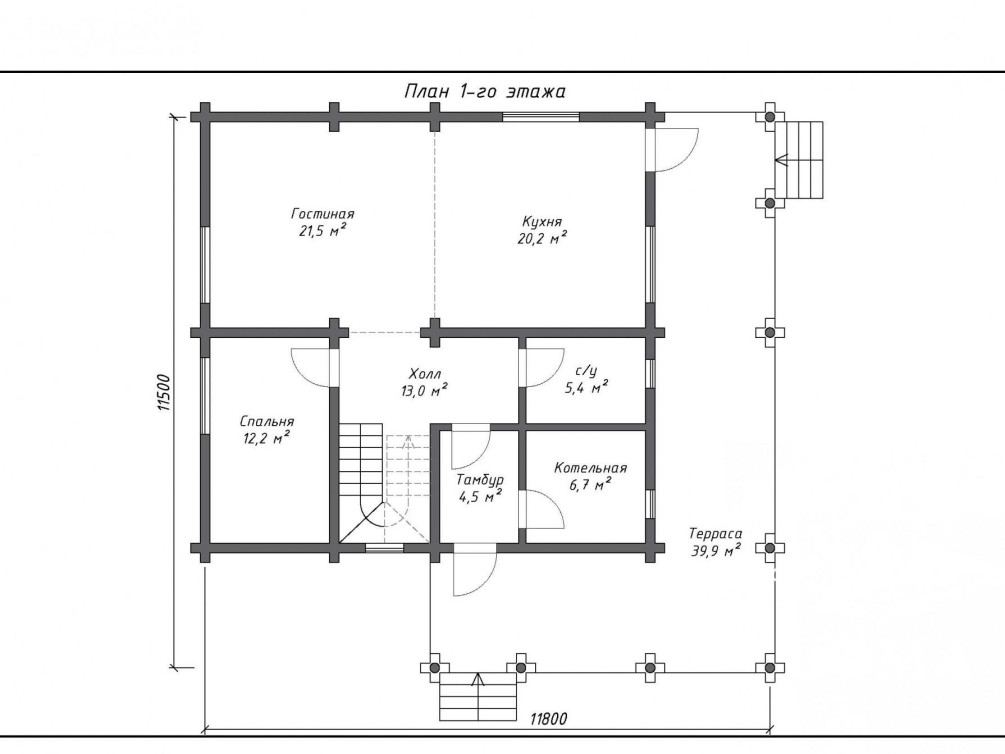 Общая площадь дома по проекту «Белая дача» — 202 м², сюда входит и крытая терраса площадью 39,9 м2. Для строительства этого дома из рубленого или оцилиндрованного бревна нам потребуется от 25 дней, при этом мы гарантируем, что сруб будет обработан антисептическим средством, который защитит дерево от биопоражений. При необходимости вы можете внести изменения в планировку, главное — сообщить о таком желании заранее.