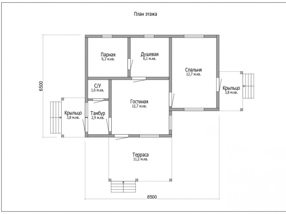 Планировка дома рассчитана на 2–3 человек. Она делит внутреннее пространство на тамбур, санузел, парную с душевой, гостиную и спальню. Попасть в санузел можно из тамбура, в спальню и душевую — из гостиной. Для удобства предусмотрены сразу три входа, в спальню и тамбур — с крыльца, в гостиную — через просторную крытую террасу. Летом террасу тоже можно использовать как зону отдыха: можно поставить на ней кресла со столиком, уличные качели, соорудить печь и готовить блюда на свежем воздухе.