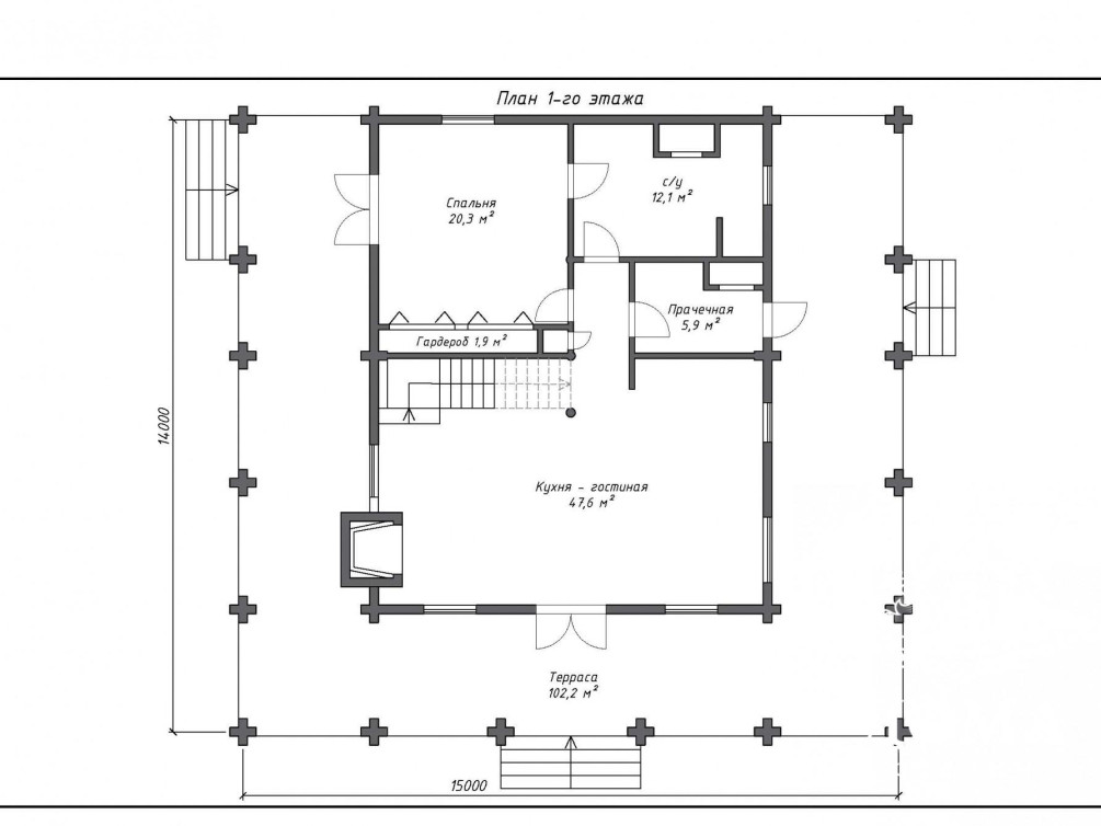 Самая главная особенность проекта — огромная терраса, окружающая дом с трех сторон. Ее площадь — 102,2 м2. Не менее важно, что в мансардном этаже архитектор предусмотрел наличие трех балконов. Таким образом, у каждого из жильцов в теплое время года будет возможность насладиться отдыхом на свежем воздухе. Внизу на террасе можно организовать несколько зон отдыха: с креслами, шезлонгами, качелями.