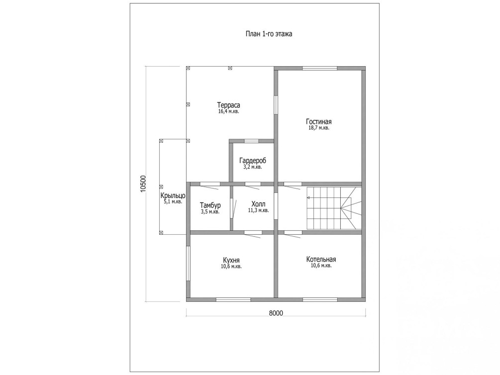 На первом этаже дома расположены холл, гардеробная, котельная, гостиная и кухня. Есть и небольшой тамбур, который поможет сохранить тепло зимой. В мансарде — три спальни, санузел и кладовая. Наличие подсобных помещений — кладовки, гардеробной — позволит вам организовать упорядоченное хранение большого количества вещей, отказаться от массивных шкафов в интерьере. Перед домом расположены угловая терраса площадью 16,4 м2. Она крытая, летом вы сможете обустроить там зону отдыха с мебелью, встречать гостей и устраивать семейные посиделки на свежем воздухе.
