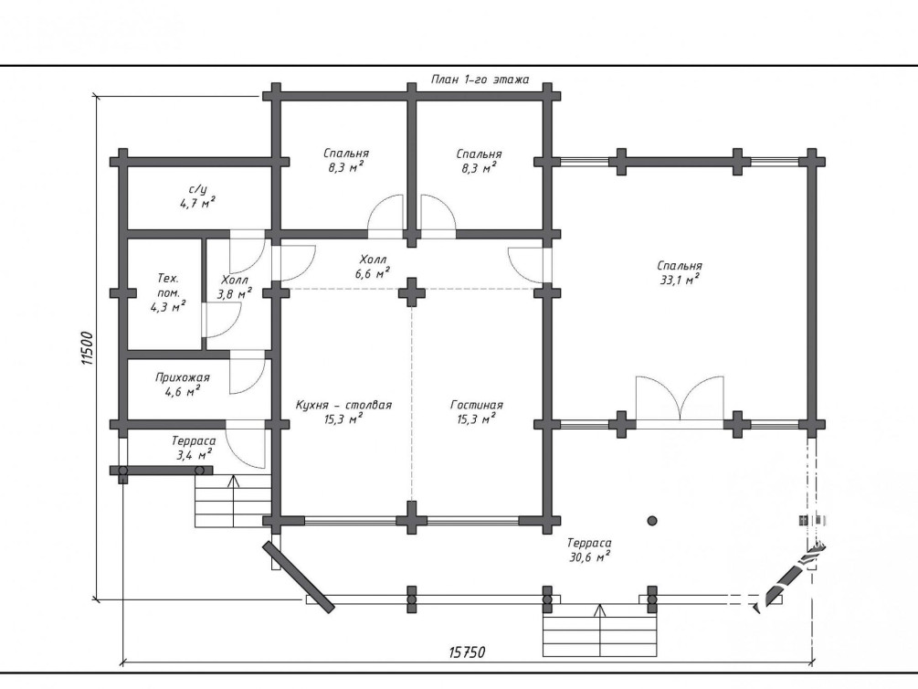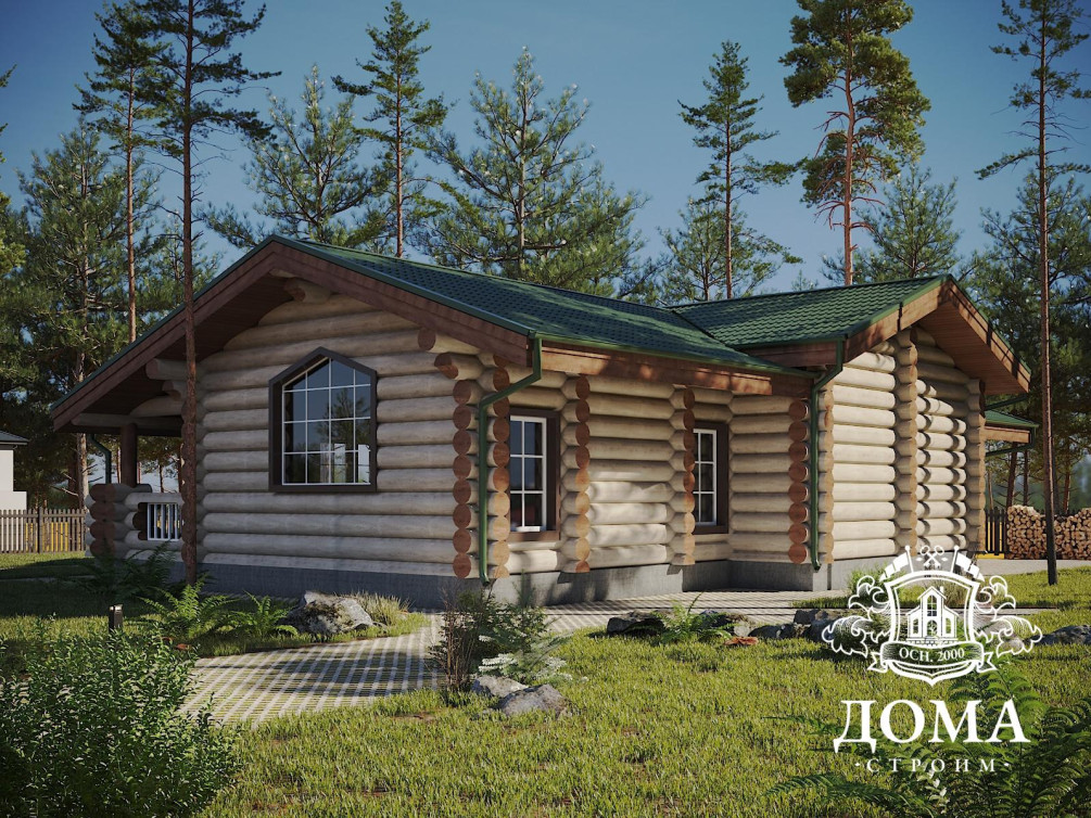 Одноэтажный дом из рубленого или оцилиндрованного бревна по проекту «Рождествено» мы построим для вас за срок от 30 дней. Уютный, светлый и просторный, он станет идеальным жильем для семьи из 3–4 человек. В качестве материала вы можете выбирать между оцилиндрованным и рубленым бревном, сруб в любом случае будет обработан антисептиком, который защитит дерево от биопоражений.