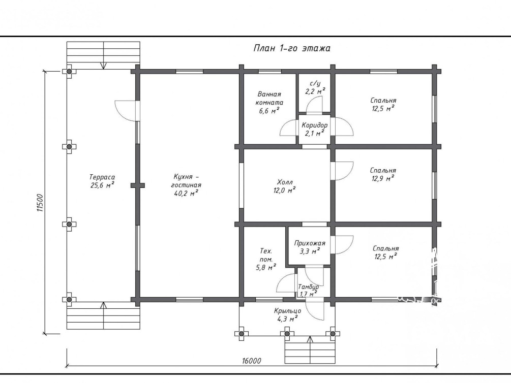 «Сибиряк» — проект одноэтажного дома общей площадью 141 м². Для его строительства нашей компании потребуется от 25 дней, в качестве материала срубы вам доступны на выбор рубленое или оцилиндрованное бревно. Бревна обрабатываются антисептиком — это необходимо, чтобы защитить дерево от биопоражений, а значит, избавить вас от необходимости сразу же принимать меры по обработке фасадов.