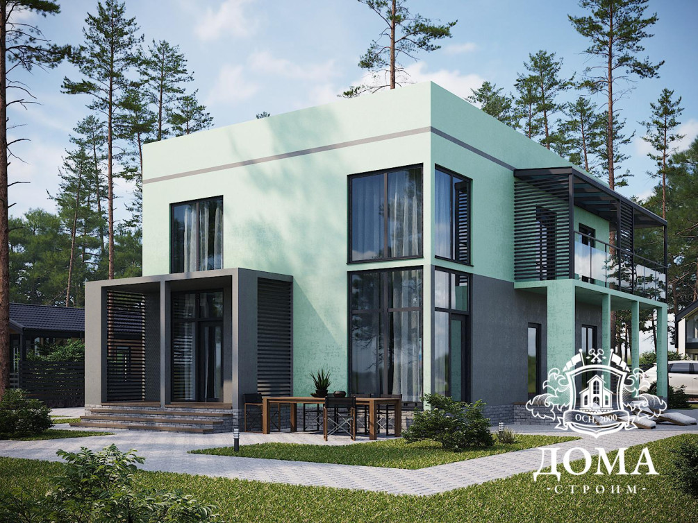 Большой двухэтажный дом по проекту «Берген» с плоской крышей общей площадью 265 м² порадует ценителей современного стиля. Практичная планировка задействует всю площадь дома, выделяя место и для отдыха, и для уединения. Украшение дома — панорамные окна, терраса и большой балкон. Они создают приятное ощущение простора, наполняют интерьер светом и свежим воздухом.