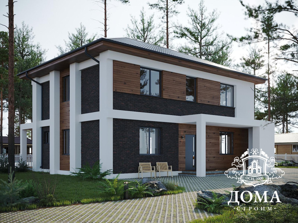 Много света, удобная планировка, современный облик фасадов — все это двухэтажный дом по проекту «Денвер» общей площадью 268 м². Планировкой первого этажа предусмотрены гостиная, кухня, санузел, техническое помещение и спальня. На втором этаже — три спальни, две из них — с собственным гардеробом, общая гардеробная и второй санузел. Планировка использует все внутреннее пространство самым эргономичным образом, но при необходимости вы можете внести в нее свои изменения.