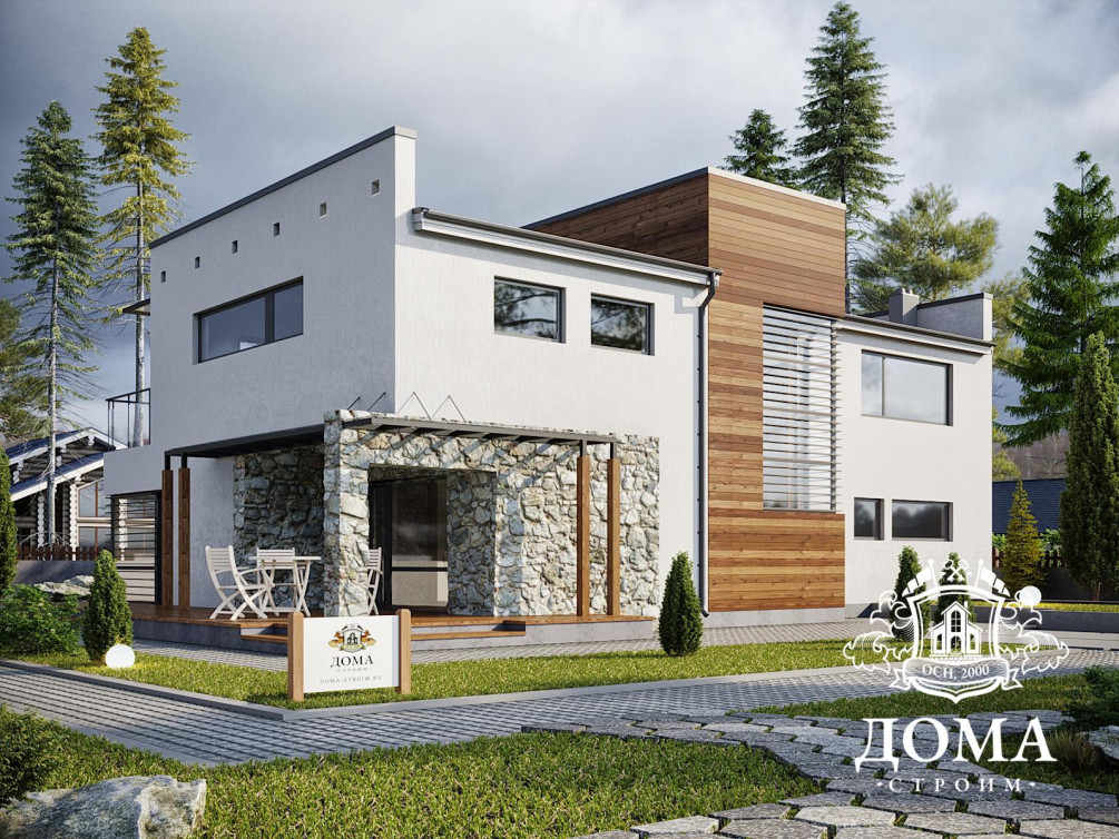 Двухэтажный дом в стиле хай-тек по проекту «Эверест» с большой террасой и балконом имеет общую площадь 374 м2. К дому примыкает гараж с котельной, из которой можно попасть в холл — такое решение вы оцените в плохую погоду, выходить на улицу после поездки или перед ней не придется.