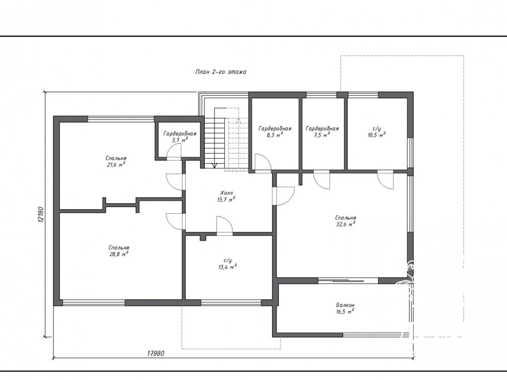На втором этаже расположены спальни. Хозяйская, площадью 32,6 м2, имеет выход на балкон, а также большую гардеробную и собственный санузел. Еще одна гардеробная прилегает ко второй спальне, третья — общая, с дверью из холла. Планировка дома учитывает потребности всех жильцов, но по вашему запросу может быть изменена.