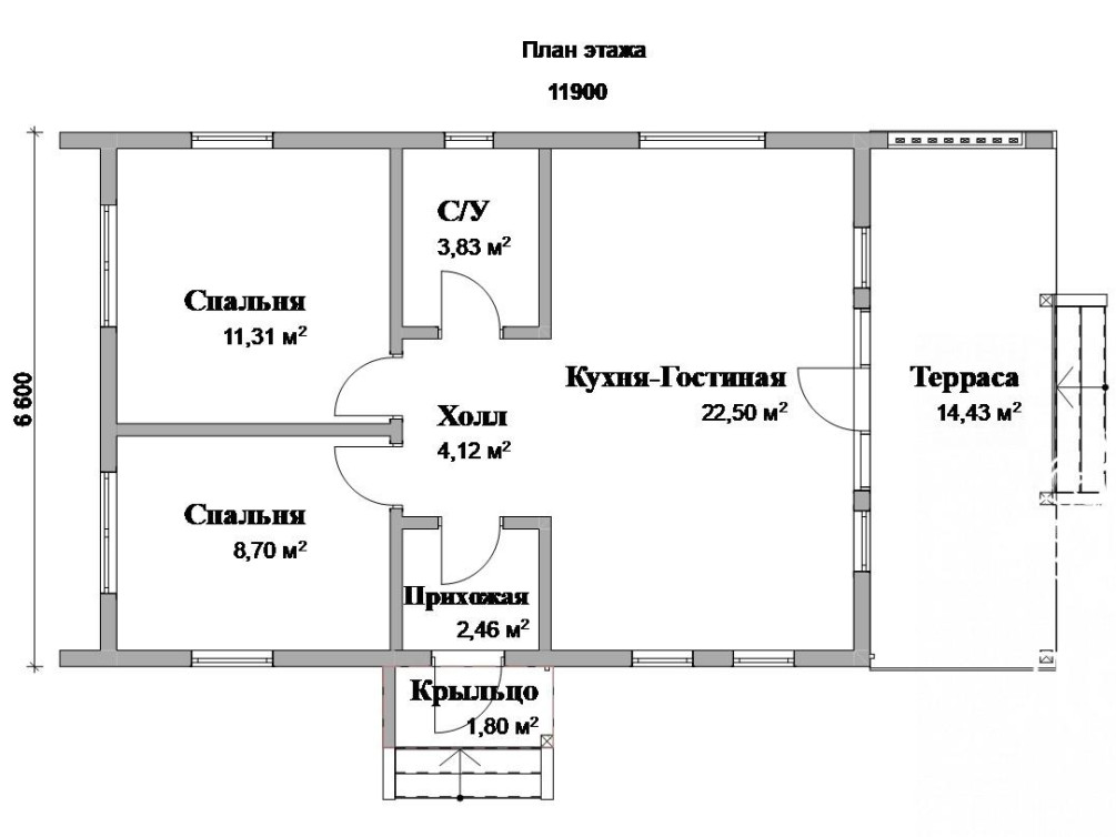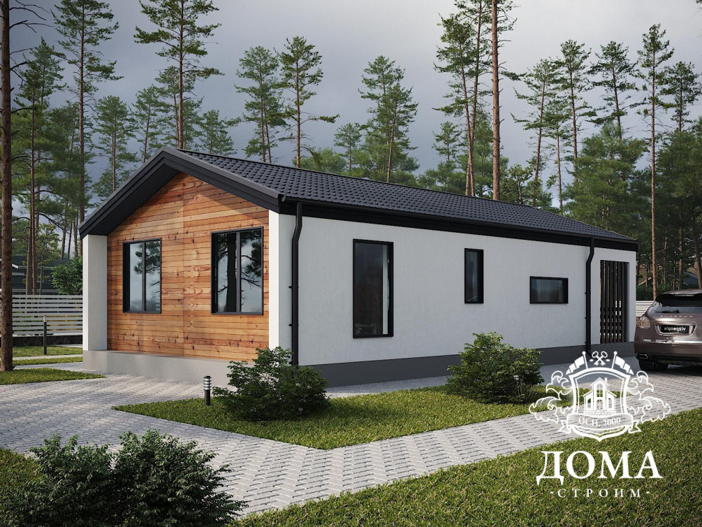 Небольшой одноэтажный дом по проекту «Феерия» подходит для сезонного проживания, но при необходимости его планировку можно изменить, выделив место под техническое помещение для установки котла. Площадь дома — 69,1 м2, при этом вся она использована рационально: в доме нет узких или длинных коридоров, поэтому на небольшом пространстве уместились и кухня-гостиная, и санузел, и две спальни.