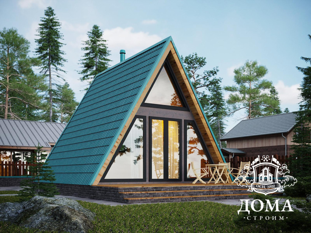 Летний дом по проекту «Горный» будет одинаково удачно смотреться и на дачном участке, и в городском ландшафте. А-образная конструкция выглядит стильно и занимает немного места, панорамное остекление наполняет дом светом и позволяет отказаться от искусственного освещения днем. Перед домом расположена просторная терраса, ее площадь — 14 м2. Летом она станет прекрасным местом для отдыха на свежем воздухе, достаточно лишь поставить на ней лежаки, качели или другую уличную мебель.
