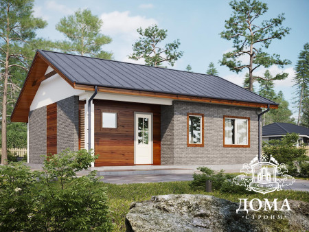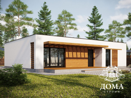 Планировка дома максимально проста: с террасы вы попадаете в гостиную площадью 26,6 м2, из нее ведет дверь в санузел, его площадь — 4,6 м2. Конфигурация санузла со скошенной передней стеной даст возможность разместить необходимую сантехнику, при этом она не нарушает гармонию основного помещения выступающим углом. В противоположной от входа стене дома есть еще один выход, ведущий на небольшое крыльцо.