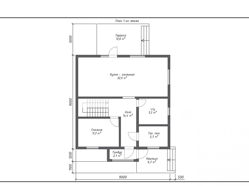 На первом этаже — большая кухня-гостиная площадью 32,9 м2, окна которой выходят на террасу, спальня, просторный санузел и техническое помещение. Из гостиной есть выход на террасу. Холл первого этажа отделен от входа тамбуром — такое решение сберегает тепло зимой и защищает от летней жары. На втором этаже — две спальни, в одной из них предусмотрен выход на балкон.