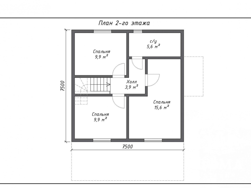 На втором этаже дома — три спальни и санузел. Одна из спален большая, предназначена для хозяев дома, две другие — по 9,9 м2, идеальны для детей.