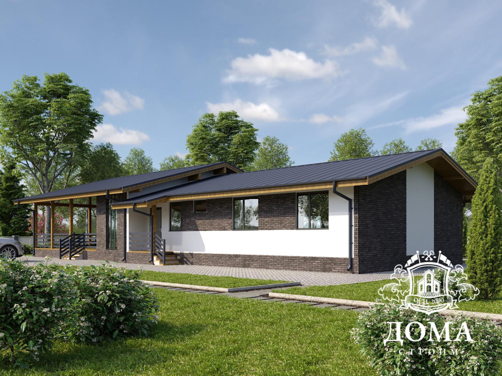 Одноэтажный дом общей площадью 233 м2 по проекту «Литвиново» подходит и для сезонного, и для круглогодичного проживания. Нестандартная планировка и огромная крытая терраса площадью почти 55 м2 делают такой дом отличным решением для ценителей комфорта. Три спальни, несколько подсобных помещений и просторная гостиная нестандартной конфигурации размещены на одном уровне, поэтому проект часто выбирают владельцы больших участков.
