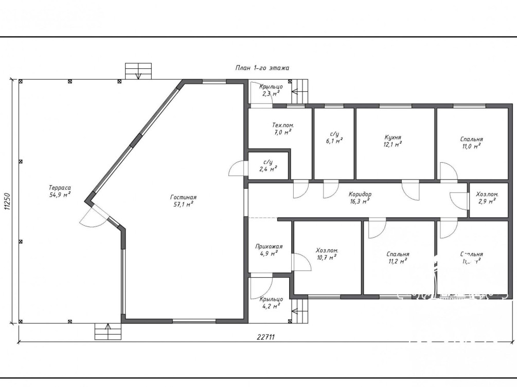 Планировкой предусмотрены два входа: со стороны главного фасада можно попасть в дом через прихожую, с другого крыльца дверь ведет в техническое помещение, откуда можно попасть в коридор. Кухня в доме изолированная, санузлов два. Панорамное остекление гостиной создает приятное ощущение простора, а также позволяет не использовать искусственный свет днем. По вашему запросу мы можем внести изменения в планировку.