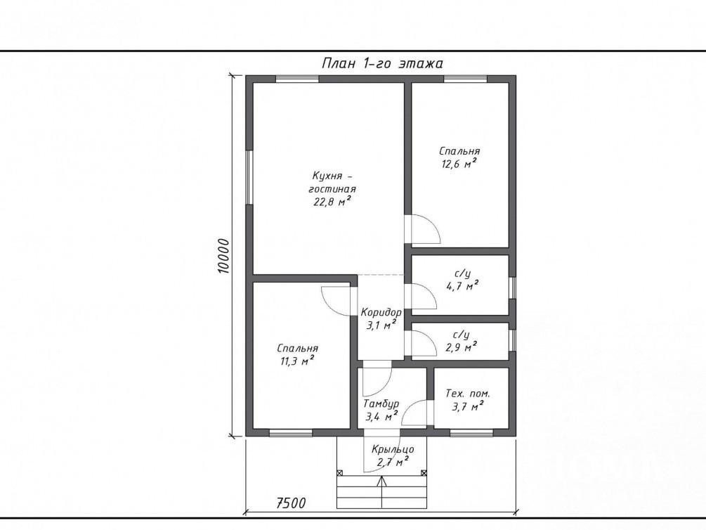 Одноэтажный дом по проекту «Майский» идеален для небольших участков, в том числе дачных. Скромные размеры не помешали архитектору вместить все необходимое для комфортной жизни: две спальни, два санузла, кухню-гостиную и техническое помещение. Вход с крыльца отделен от коридора небольшим тамбуром, где можно поставить шкаф для одежды. Техническое помещение площадью 3,7 м2 оптимально подходит для установки котла, а в доме для сезонного проживания может использоваться в качестве кладовой.