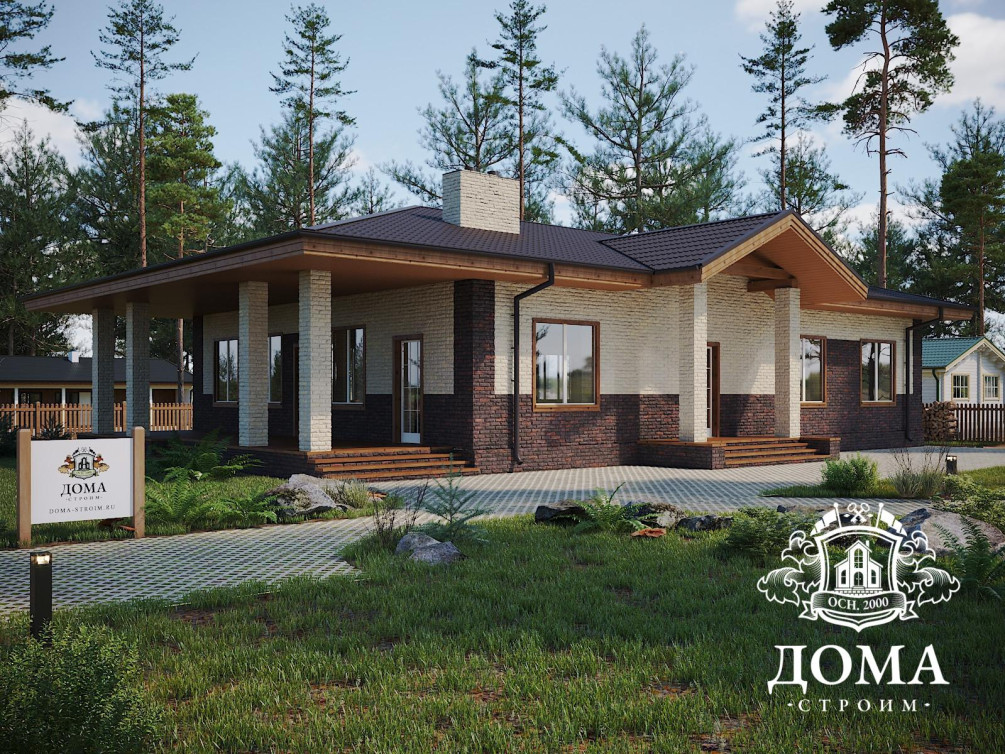 Если у вас нет необходимости искать способ уместить большой дом на скромном земельном участке, выбирайте проект «Мечтаево» — все помещения в нем расположены на одном уровне, а значит, жить будет максимально комфортно членам семьи любого возраста. Общая площадь дома с террасой — 198 м2.