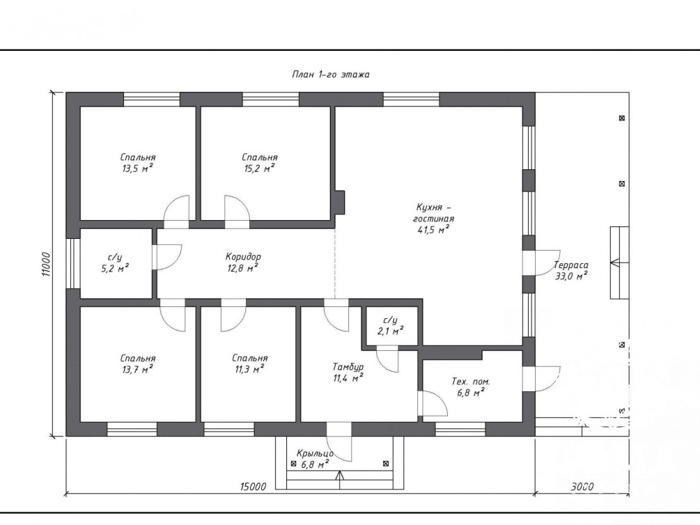 Планировка дома учитывает все потребности семьи: все четыре спальни изолированы, чтобы отдыху, работе и другим занятиям жильцов ничего не мешало. А собираться всем вместе будет приятно в просторной кухне-гостиной — ее площадь составляет 41,5 м2. В доме два санузла: один прямо у тамбура, второй — в коридоре между спальнями. Это удобно, когда по утрам на работу или учебу собираются сразу несколько человек.
