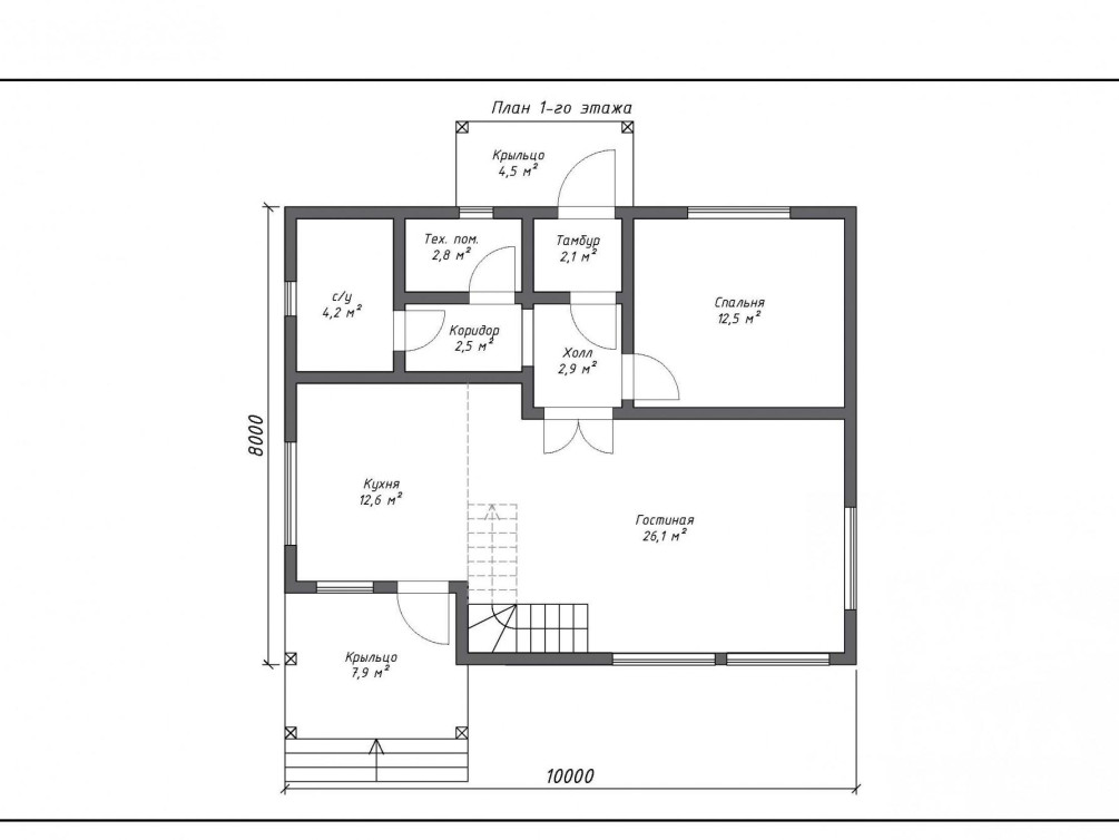 Планировка дома продумана до мелочей: для кухни предусмотрен отдельный вход со своим крыльцом — если вы сами занимаетесь покупками продуктов, то обязательно оцените такое решение, не придется нести пакеты через длинный коридор и несколько дверей. Есть вход и с другой стороны, через тамбур и холл оттуда можно попасть в спальню или гостиную. Между гостиной и кухней нет перегородки, но помещения разграничены лестницей и конфигурацией стен.