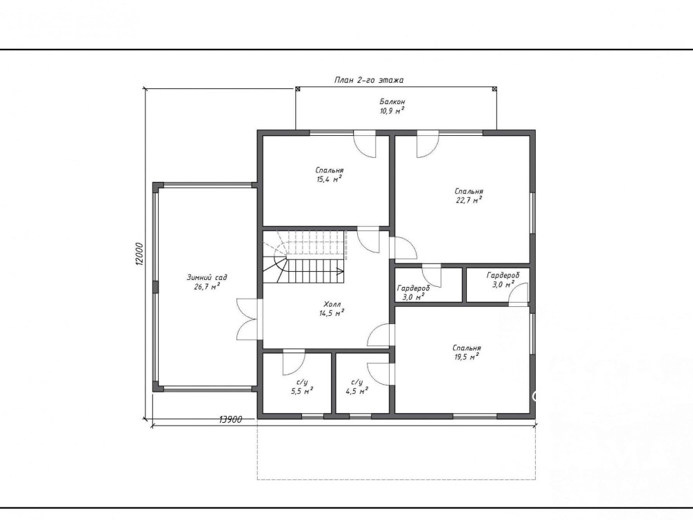 На втором этаже — три спальни, две из них с выходом на общий балкон, из хозяйской спальни ведут двери в гардеробную и санузел. Еще один общий санузел имеет площадь 5,5 м2. Изюминка второго этажа — большой зимний сад с панорамными окнами на три стороны. Комната буквально залита светом с утра до вечера.