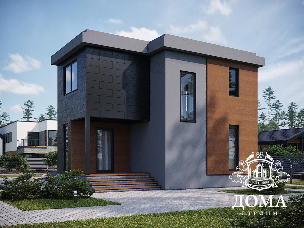 Просторный, ультрасовременный двухэтажный дом с плоской крышей привлекает внимание ценителей практичности и эстетики. Общая площадь вместе с террасой — 149,4 м2, чего вполне достаточно для семьи из 4–5 человек. Просторная кухня-гостиная с окнами на террасу, две спальни наверху, два санузла, большой тамбур — каждое помещение в доме функционально, чтобы вы могли разместить мебель и системы хранения наиболее удобным образом.