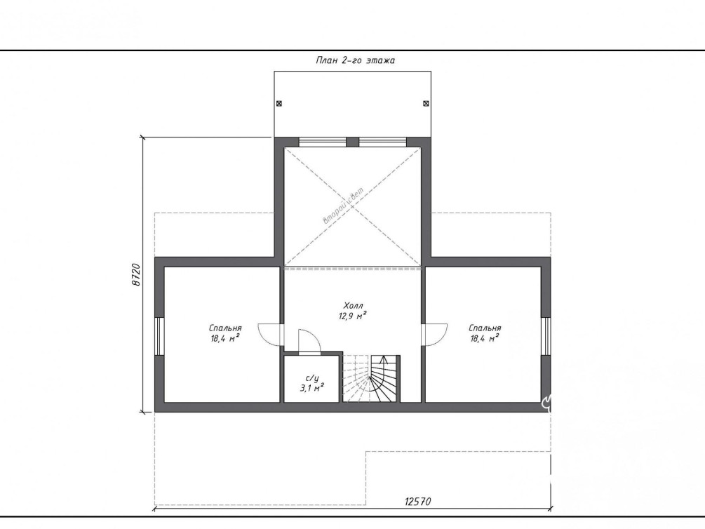 На втором этаже находятся две спальни с зеркальным расположением, холл, санузел, а также окна второго света — благодаря им гостиная наполнена воздухом. Естественное освещение в светлое время суток способствует хорошему самочувствию и настроению.