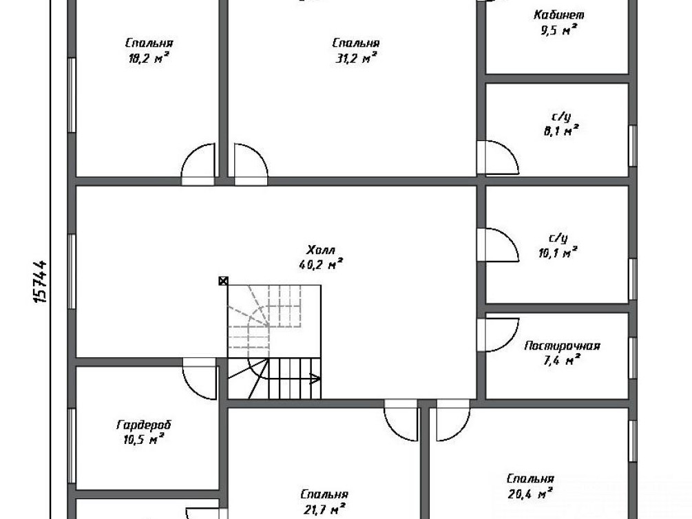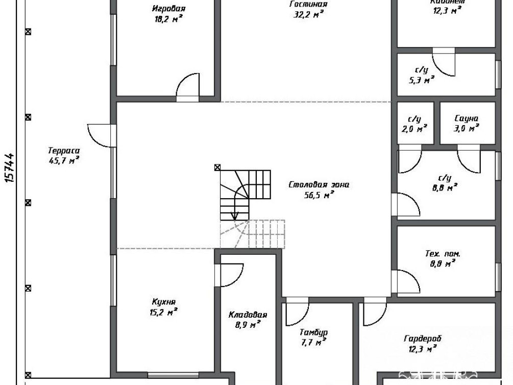 Кухня, гостиная и столовая зона объединены в одно помещение, но при желании их можно зонировать перегородками. К кухне примыкает большая кладовая площадью 8,9 м2 — продуманное решение для загородной жизни, где всегда необходимо иметь запасы продуктов. Если захотите внести изменения в планировку, просто сообщите нам об этом.