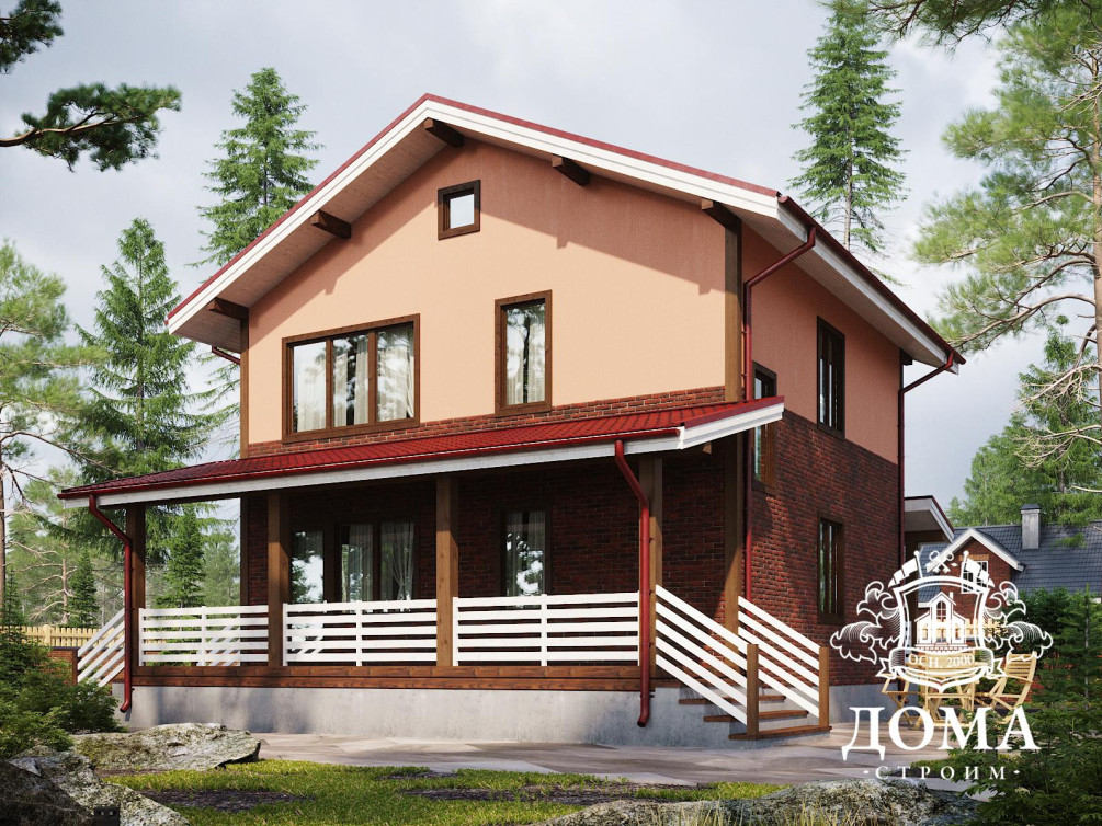 Двухэтажный дом по проекту «Академик» общей площадью 182,2 м² будет построен за срок от 45 дней. Тщательно соблюдая технологию и используя только качественные материалы, мы можем гарантировать, что дом будет соответствовать вашим ожиданиям — будет теплым, красивым, светлым. Пиломатериалы проходят камерную сушку и антисептическую обработку, а материалы для отделки фасадов выбираются из числа лучших. В этом проекте фасады отделаны акриловой колерованной штукатуркой Ceresit с красивой фактурой «короед».