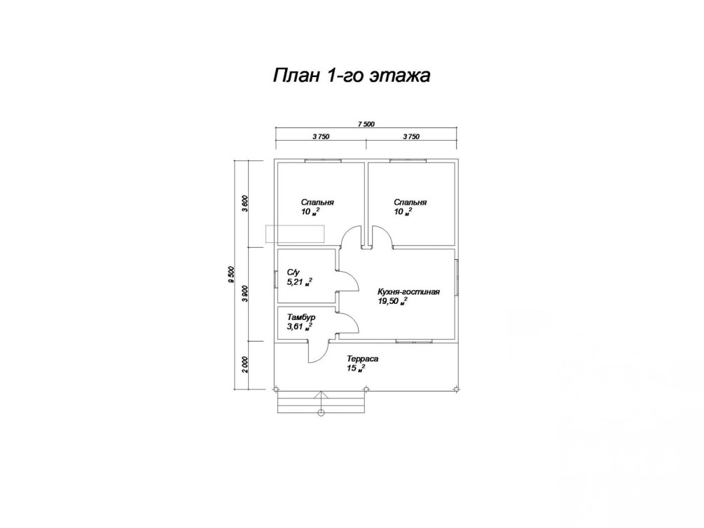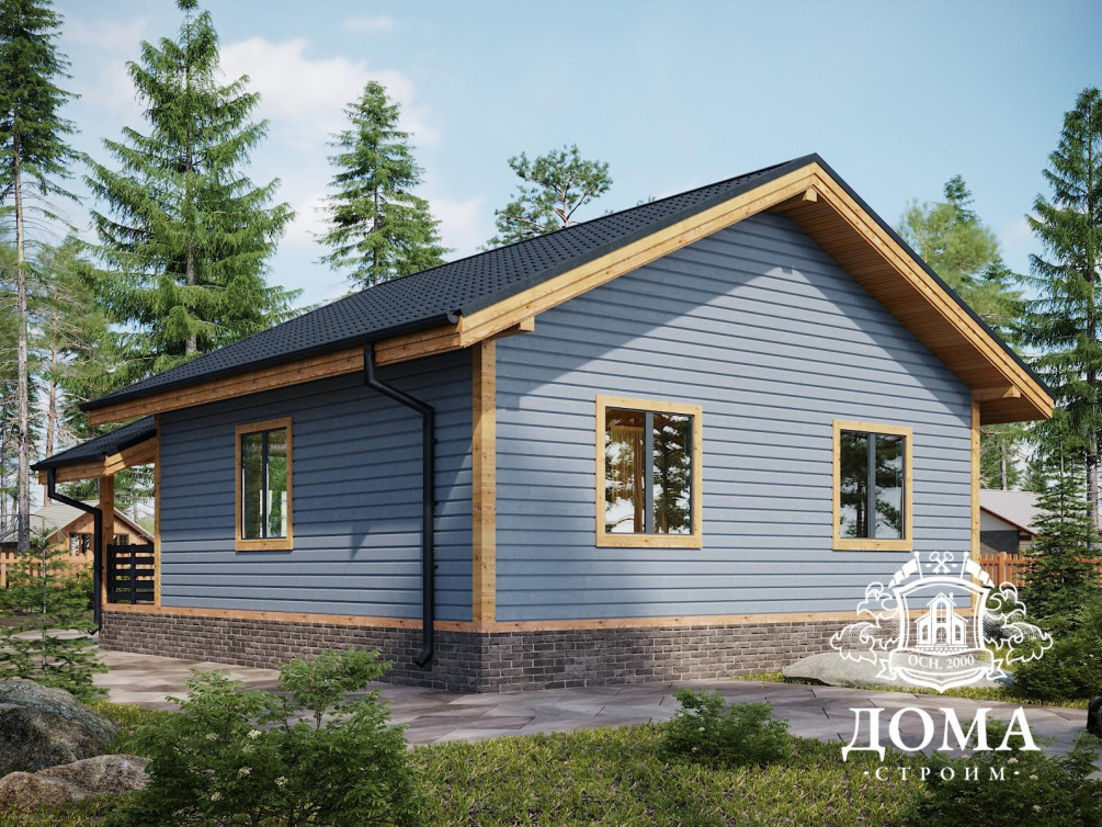 «Алтай» — это проект одноэтажного дома с большой террасой перед главным фасадом. Общая площадь — 71 м², а строительство по каркасной технологии займет от 25 дней. В этот срок не включены финишные работы, но и они не затянутся надолго. Несмотря на небольшие размеры, дом сделает комфортной жизнь семьи из 2–4 человек. Для того его планировкой предусмотрено все необходимое: две спальни, санузел, кухня-гостиная.