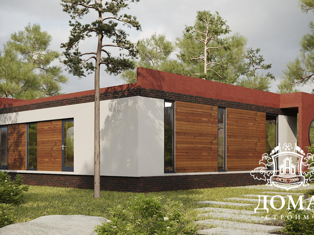 Одноэтажный дом с плоской крышей с панорамными окнами на главном фасаде — это проект «Астория». Общая площадь дома составляет 156,3 м², а строительство по каркасной технологии занимает от 25 дней. Мы используем пиломатериалы камерной сушки, обработанные антисептиком. В совокупности с соблюдением технологии это гарантирует долгие годы беспроблемной эксплуатации дома.