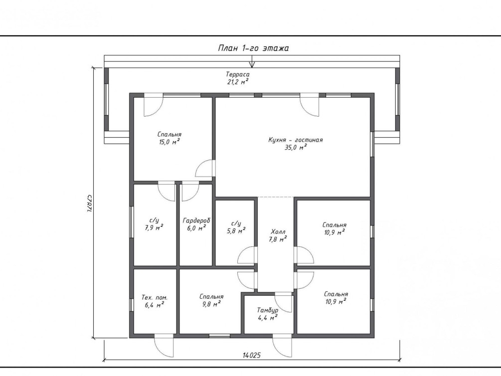 Планировка дома рассчитана на семью из 3–5 человек. В нем четыре спальни, одна из них — с собственным санузлом и гардеробной, кухня-гостиная площадью 35 м2, общий санузел и техническое помещение. Перед входом — небольшой тамбур для снижения теплопотерь зимой. У технического помещения — собственный вход с улицы. Планировку можно изменить, если хотите, просто сообщите нам о своих пожеланиях заранее.