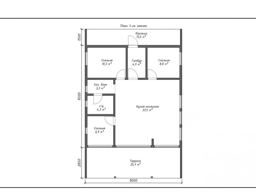 Планировка дома учитывает его небольшую площадь и рационально использует каждый квадратный метр: большая кухня-гостиная окружена тремя спальнями, есть хозяйственное помещение, тамбур.