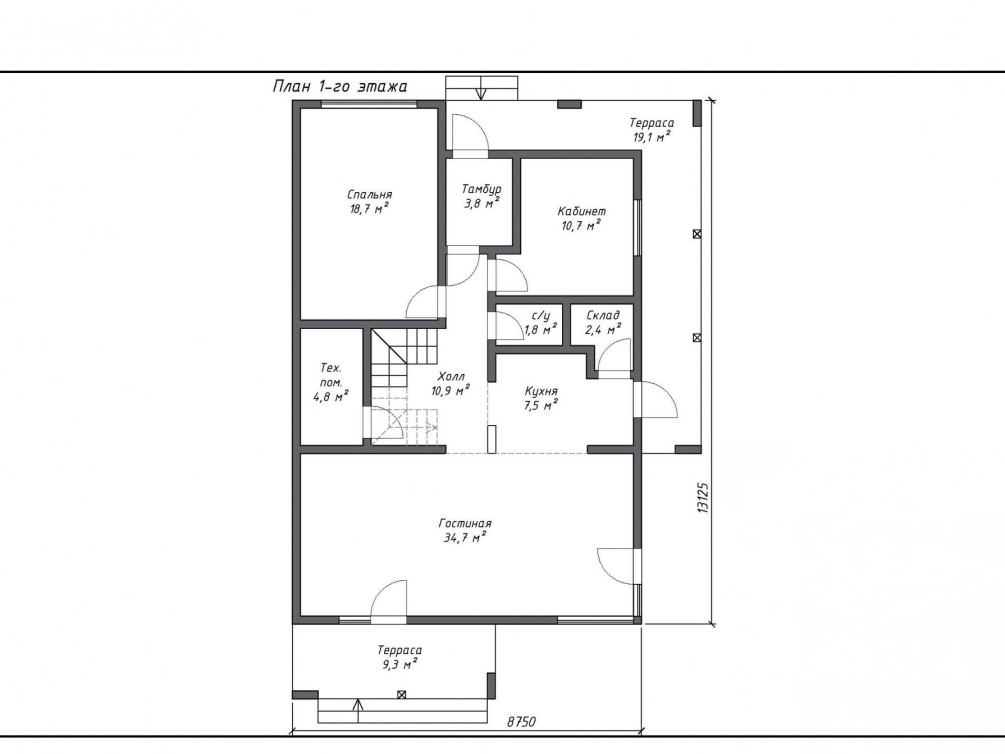 На первом этаже дома расположены спальня, кабинет, кухня, гостиная, санузел и подсобные помещения: кладовая и котельная. Наверху — еще три спальни и два санузла, а часть пространства отдана под организацию второго света. Входов в дом четыре, можно попасть сразу в кухню, гостиную или в тамбур. Терраса и балкон в теплое время года превратятся в место сбора всей семьи за завтраком и место отдыха на свежем воздухе.