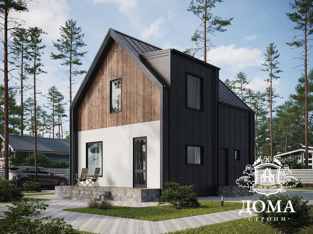 Строгий, даже немного готический вид придает дому по проекту «Беркут» отделка фасадов планкеном, кликфальцем и колерованной акриловой штукатуркой Ceresit. Общая площадь дома — 112 м², включая мансарду и небольшую открытую террасу. Для строительства такого дома по каркасной технологии требуется всего от 25 дней. Обратите внимание, что в этот срок не входят финишные работы, которые также может взять на себя наша команда специалистов.