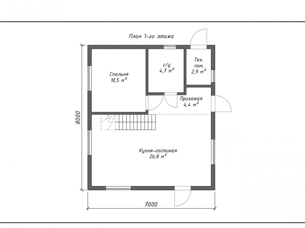 Планировку дома при желании можно изменить, согласно проекту, она включает в себя кухню-гостиную, спальню, техническое помещение на первом этаже, а также две смежные спальни в мансардном этаже. Такая планировка использует все внутреннее пространство. Объединение гостиной и кухни дало возможность создать просторное и светлое помещение с окнами на три стороны и выходом на террасу.