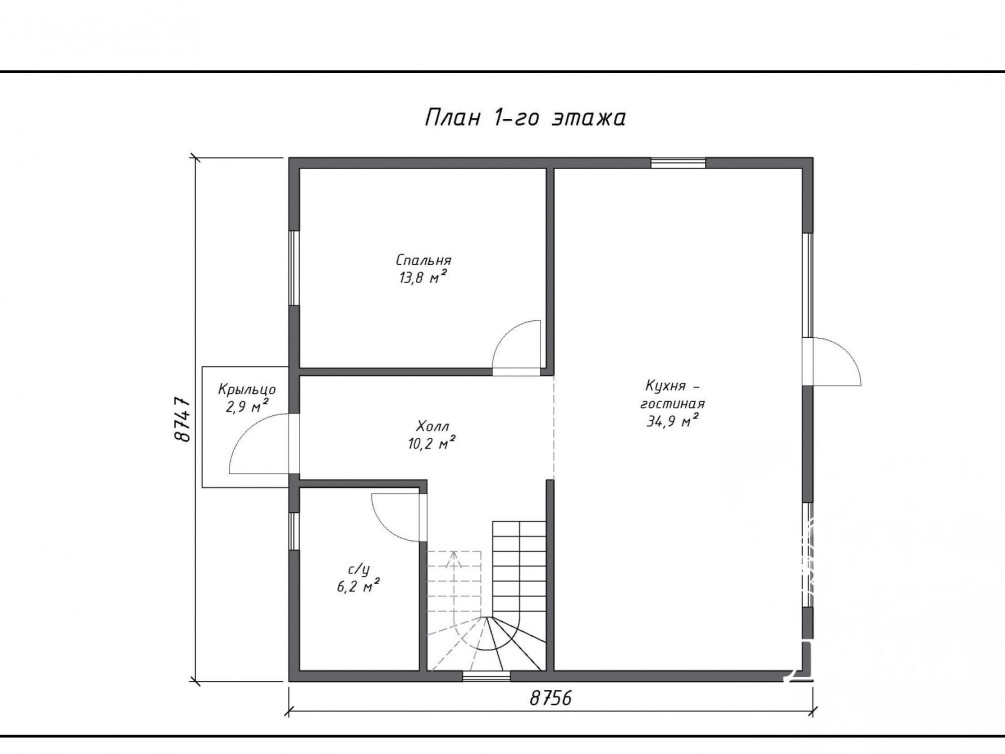 Планировкой первого этажа предусмотрены кухня-гостиная, спальня и санузел. Из гостиной есть отдельный выход, а окна на две стороны наполняют помещение светом. Объединение гостиной с кухней дает вам возможность не подстраиваться под рамки небольших комнат, а расставить мебель и технику наиболее удобным для себя образом.