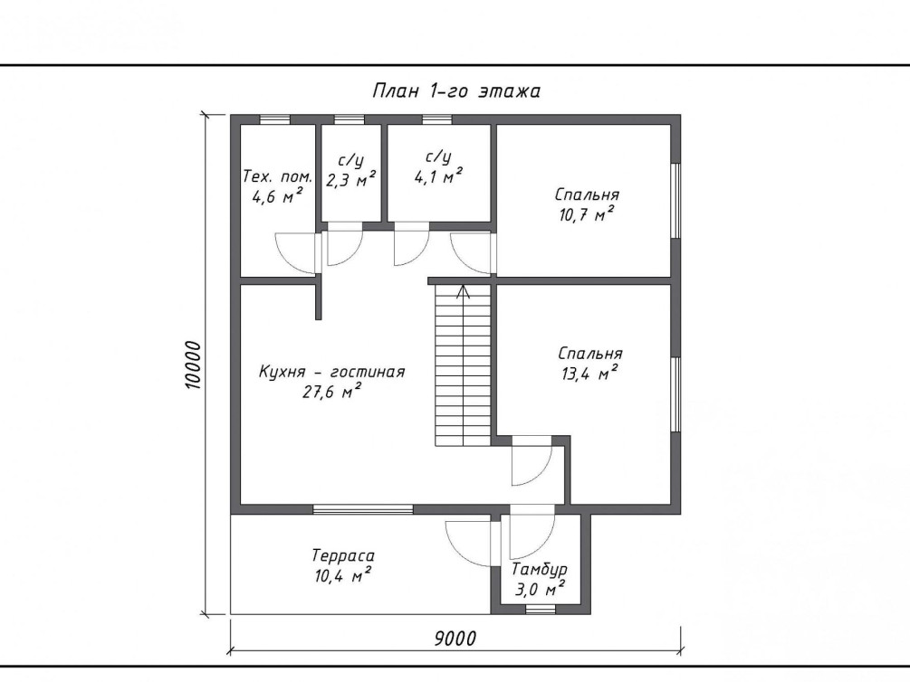 На первом этаже дома расположены две спальни, кухня-гостиная, два санузла и техническое помещение — его можно превратить в котельную. На втором, мансардном этаже, еще две комнаты. Вообще планировка дома может быть изменена по вашему запросу, просто сообщите нам, что бы вы хотели получить в итоге, и мы найдем способ воплотить ваши пожелания в жизнь.