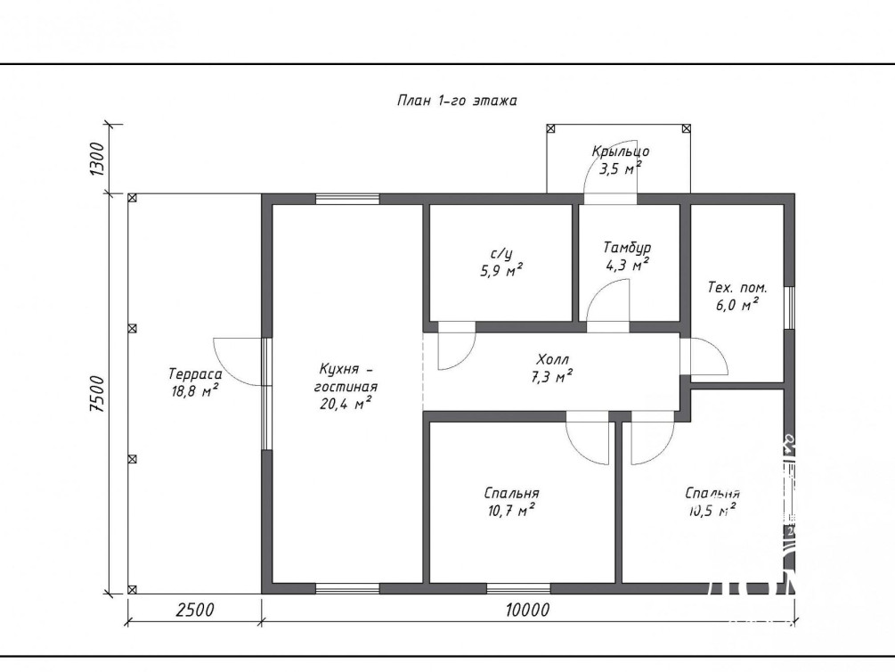 Планировку дома мы можем изменить, адаптировать под ваши пожелания. Например, если вы планируете жить в доме только летом, можно отказаться от технического помещения и за счет его площади увеличить другие комнаты.