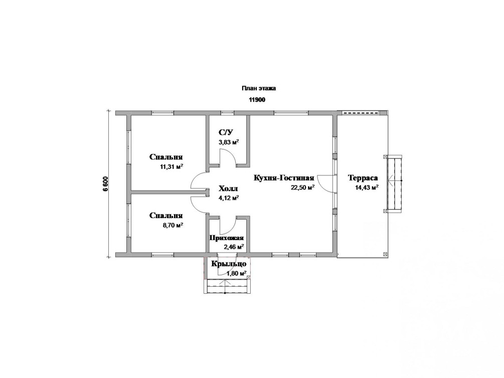 Входов в дом два: с террасы можно попасть сразу в кухню-гостиную, это помещение с окнами на три стороны, которые наполняют его естественным светом. Второй вход — на другой стороне дома, через крыльцо и прихожую. Планировкой предусмотрены также две спальни и санузел.