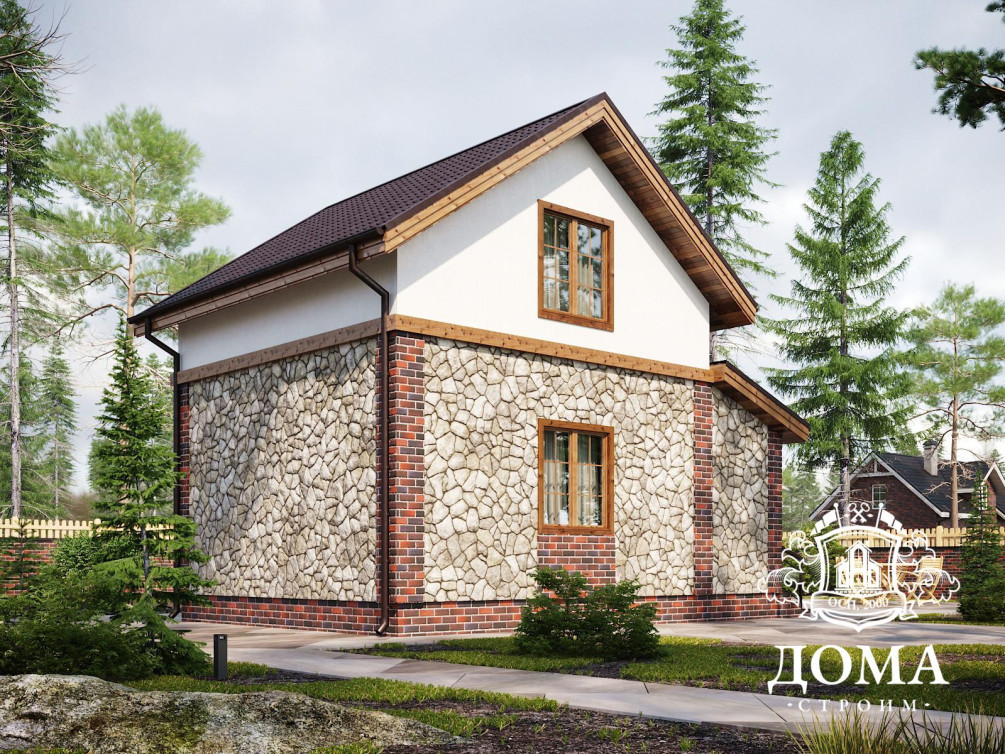 Проект «Глория» предназначен для небольших участков: общая площадь дома с мансардой составляет 86,2 м². Комбинированная отделка фасадов панелями и штукатуркой на акриловой основе придает дому современный вид, выгодно выделяет его и подчеркивает современный архитектурный стиль.
