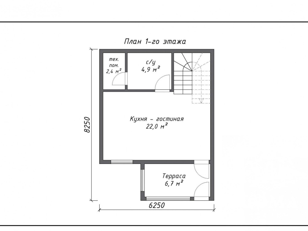 Планировка дома заслуживает внимания: она полностью использует все полезное пространство, здесь нет коридоров, бесполезных темных углов. Перед главным фасадом расположена застекленная веранда, ее площадь — 6,7 м2. Кухня и гостиная объединены, в результате чего получилось помещение площадью 22 м2. На первом этаже также расположены санузел и подсобное помещение, его можно использовать как котельную. В мансарде — просторный холл и спальня. Обратите внимание: по вашему запросу мы готовы внести изменения в планировку.