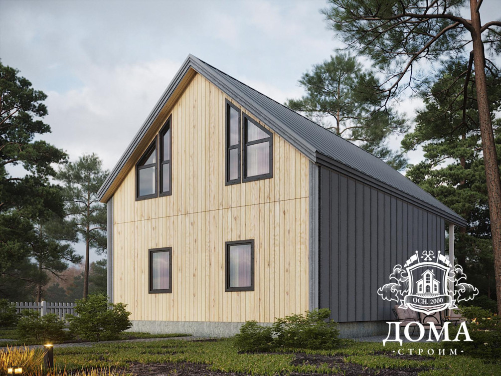 Отделка фасадов в этом проекте комбинированная, кликфальцем и имитацией бруса. В результате получается стильный и аккуратный внешний вид дома. Материалы отделки устойчивы к внешним воздействиям, не выцветают на солнце и не боятся влаги.