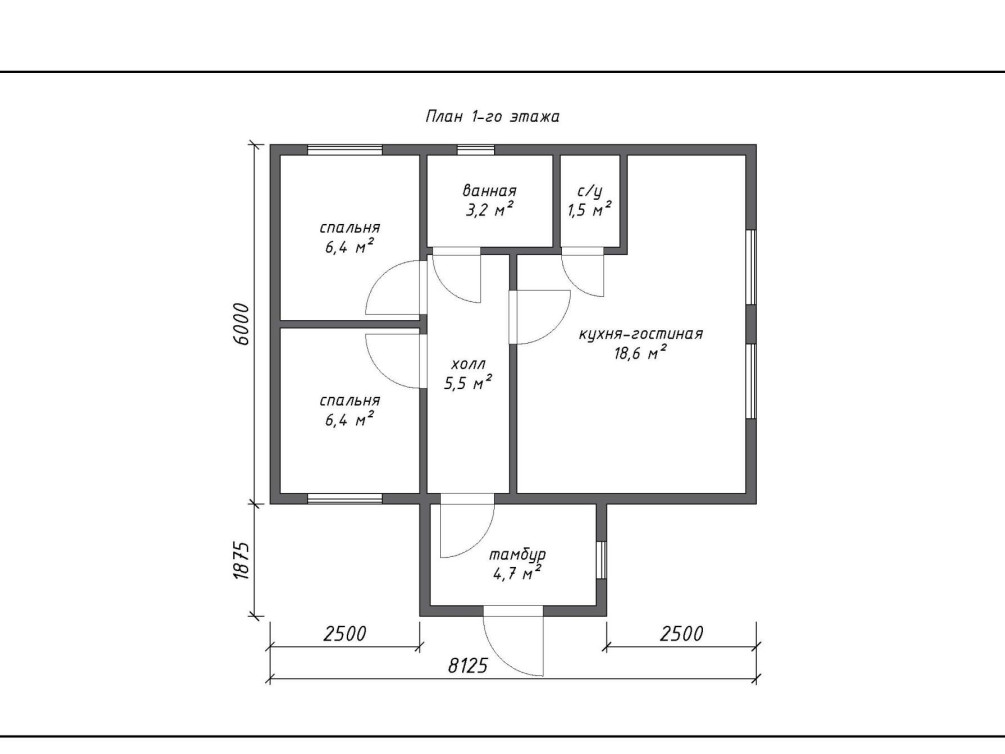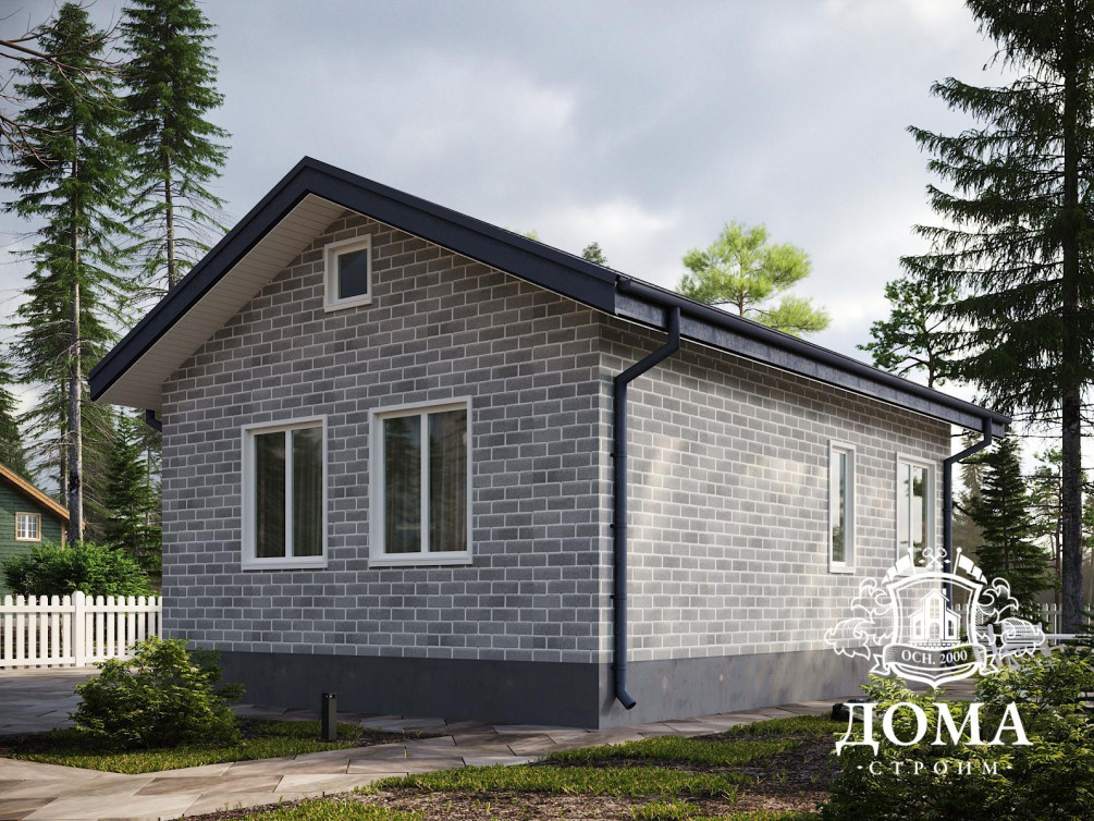 Планировка дома делит его внутреннее пространство на тамбур, ванную, санузел, холл, а также две изолированных спальни и кухню-гостиную. Объединение гостиной и кухни сделало возможным удобное зонирование помещения: хватит места и для мягкой мебели, и для крупной бытовой техники, и для гарнитура. Если вы захотите, в планировку можно внести изменения: убрать или подвинуть перегородки, добавить их. Главное, чтобы вы сообщили нам о своих пожеланиях заранее, до начала строительства. Мы обязательно найдем решение, чтобы готовое жилье полностью отвечало потребностям вашей семьи. Финишные работы по отделке цоколя, фасадов, монтажу водостоков вы тоже можете доверить нашим мастерам.