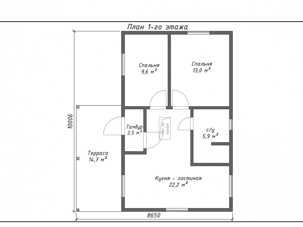 Планировка дома функциональная: внутреннее пространство разделено на две спальни, тамбур, санузел и кухню-гостиную. Объединение двух помещений в одно позволило сделать комнату светлой — окна в кухне-гостиной выходят на три стороны, это визуально расширяет пространство, дает ощущение простора, свободы. К тому же так вы не будете ограничены стандартными приемами зонирования и расстановки мебели. При необходимости планировку можно изменить.