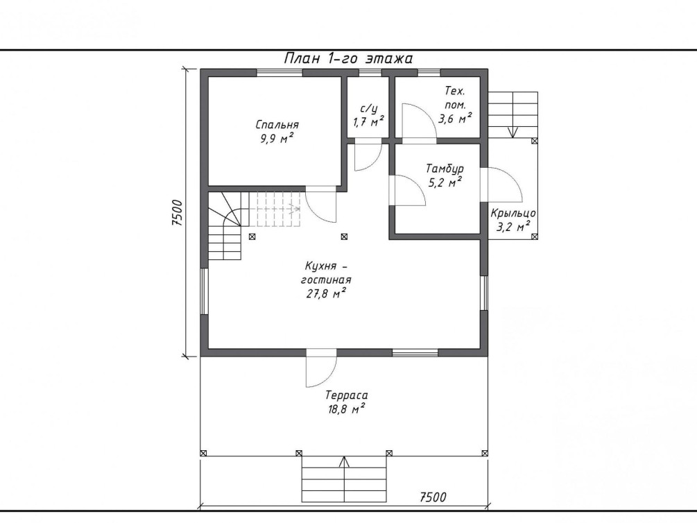 Планировка первого и мансардного этажей задействует все внутреннее пространство. Внизу расположены кухня-гостиная с окнами на три стороны и выходом на террасу, санузел, техническое помещение и спальня. Наверху — еще один санузел и три спальни. Такая планировка, при которой приватные комнаты расположены наверху, а общие — внизу, очень рациональна и проверена временем. А климатические условия большинства регионов нашей страны диктуют необходимость тамбура перед жилыми помещениями. Но, если вы захотите, мы внесем в планировку изменения.