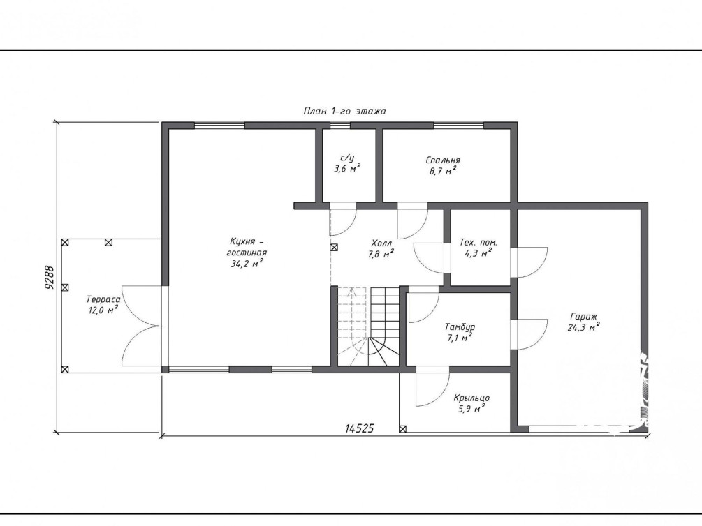 Планировку дома можно изменить, но в целом она вполне удобная и рассчитана на большую семью с автомобилем — к дому примыкает гараж, попасть туда можно с улицы, через техническое помещение и через тамбур. На первом этаже расположены кухня-гостиная площадью 34,2 м2, спальня, санузел. Спальню внизу можно отдать пол гостевую или превратить в кабинет. На втором этаже — еще четыре спальни и санузел. Из двух спален предусмотрен выход на балкон. Основных входов в дом два: с крыльца и с террасы, сразу в гостиную.