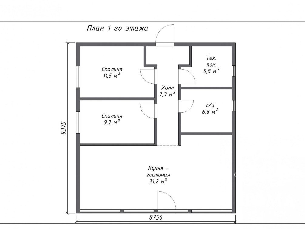Главная особенность проекта «Персей» — главный фасад с панорамным остеклением, которое наполняет внутреннее пространство дома естественным светом с утра до вечера. Планировка дома максимально задействует его полезную площадь: на ней разместились также две спальни, санузел и техническое помещение. Если потребуется, в нее можно внести коррективы, чтобы она полностью отвечала потребностям вашей семьи.