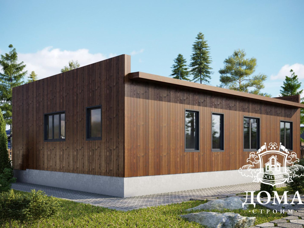 Проект одноэтажного каркасного дома «Румянцево» общей площадью 110,37 м² выбирают те, кому важно не только содержание, но и форма. Плоская крыша, отделанные планкеном фасады выделяют этот дом на фоне обычных однотипных построек. А грамотное использование внутреннего пространства позволило уместить все необходимое для семьи из 2–3 человек. Это просторная гостиная, кухня, две спальни, техническое помещение и санузел.