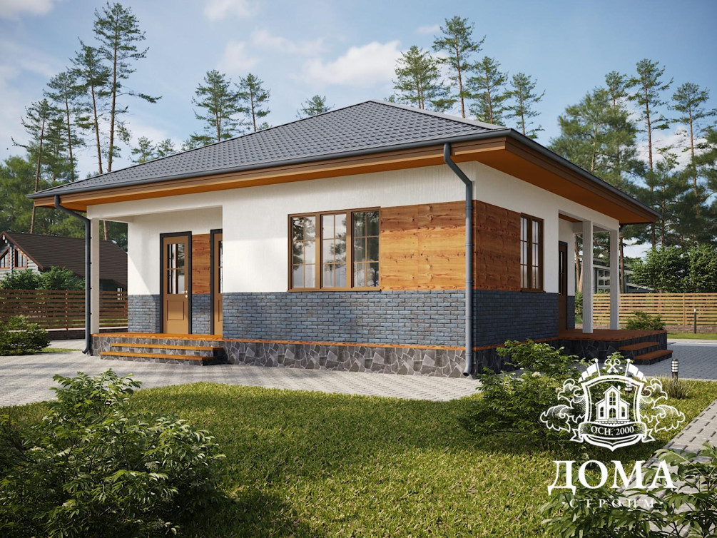 Одноэтажный дом «Сенатор» мы построим для вас за срок от 25 дней, используя пиломатериалы камерной сушки и строго соблюдая каркасную технологию сборки. Закажите у нас финишные работы, и мы полностью подготовим ваш дом к переезду: отделаем фасады штукатуркой на акриловой основе и фиброцементными панелями, установим водостоки и так далее.